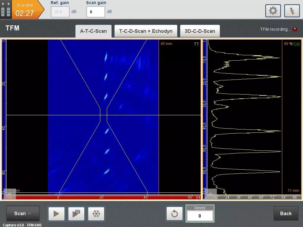 *新的Gekko有可支持多达128个通道的实时全聚焦成像技术,有更好的信号质量和更高的TFM分辨率,极大地提高了检出率和检测员的信心,所以可以达到更快扫查的速度和更高的效率。同时Gekko支持在全聚焦模式下进行TCG校准,使得定量更加准确。